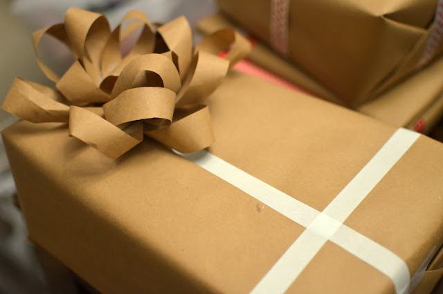 Using the same brown wrapping papers i made a bow to decorate the already wrapped gift.